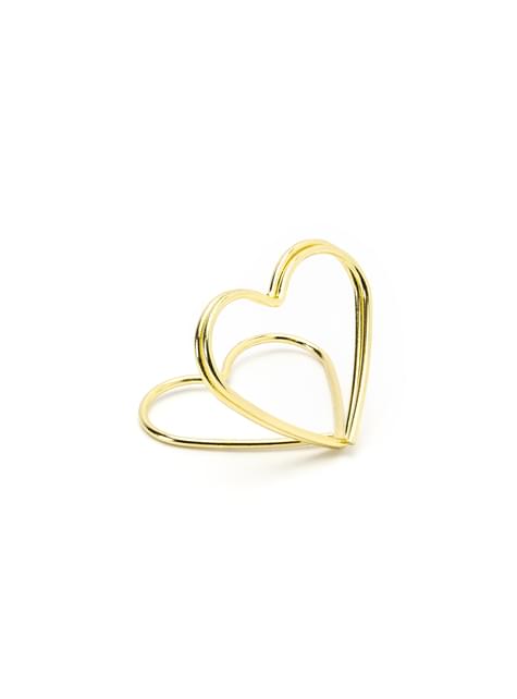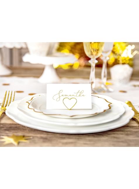 Set med 10 korthållare i form av guldfärgat hjärta för bordsdukning - Gold Wedding